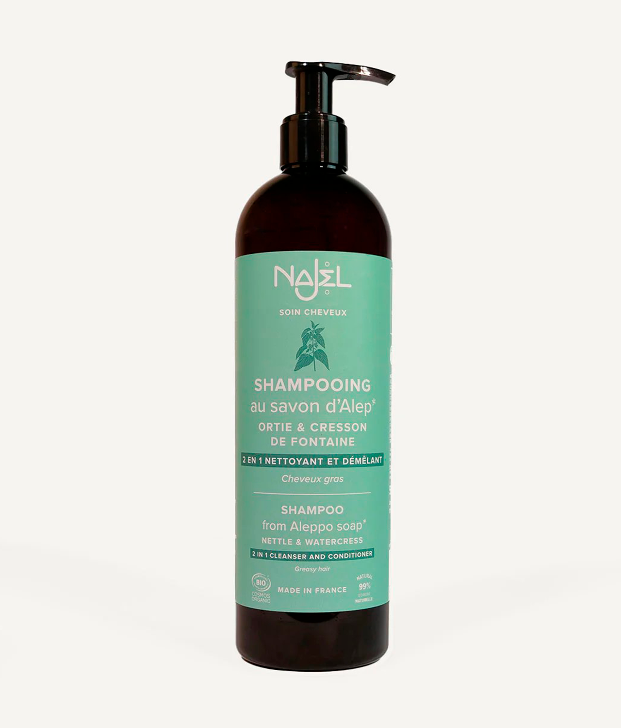 Descubre nuestro champú líquido con jabón de Alepo, especialmente formulado para cabello graso. Este champú ancestral combina los beneficios del aceite de oliva y del aceite de laurel para purificar y revitalizar tu cuero cabelludo. El aceite de oliva, rico en antioxidantes, nutre y fortalece el cabello, mientras que el aceite de laurel regula el exceso de sebo y proporciona una sensación de frescura duradera. Enriquecido con agua de manzanilla, este champú orgánico y de origen natural elimina las impurezas a la vez que aporta brillo y luminosidad a tu cabello. Gracias a la combinación de ortiga, culantrillo de Montpellier y berros, este champú purifica y limpia el cabello, devolviéndole su flexibilidad y vitalidad. Su acción limpiadora y desenredante 2 en 1 mantiene el cabello limpio y fácil de peinar.